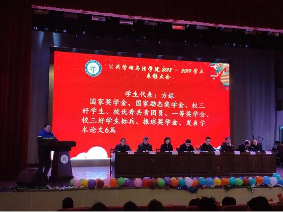 在庄严的国歌声中拉开了此次表彰大会的帷幕。大会上,国家奖学金、校三好学生标兵获得者行政162班方録作为学生代表发言,分享了自己三年来的经历体会与学习经验。随后,优秀班主任张增国老师作为教师代表上台发言。伴随着激昂欢快的音乐,院长徐济益宣读表彰大会文件,领导们为学生代表颁发奖状与证书。最后,院党委书记胡卫东对获奖的先进集体和个人表示热烈祝贺,并寄语同学们以优秀学子为榜样,不忘奋斗初心、砥砺前行。