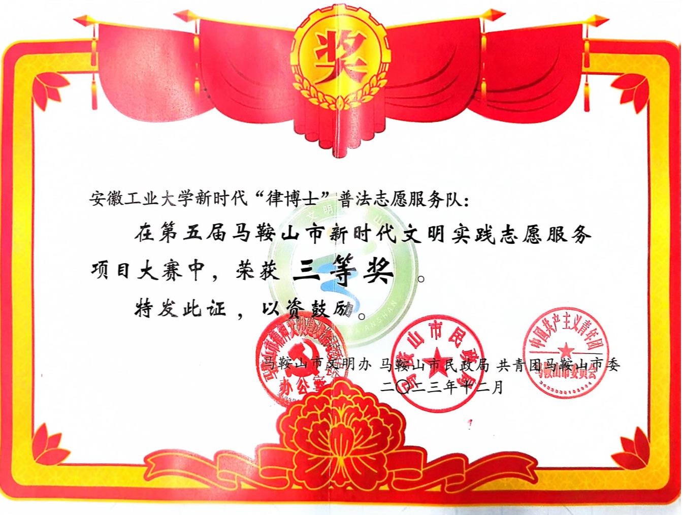 “律博士”普法志愿服务队参加竞赛,“律博士”普法志愿服务队立足于安徽工业大学校级普法宣传平台,以青年力量进行法制宣传教育,不断增强普法宣传面及法治的渗透力,经过项目决赛角逐,“律博士”普法志愿服务队获马鞍山第五届新时代文明实践志愿服务项目大赛三等奖。