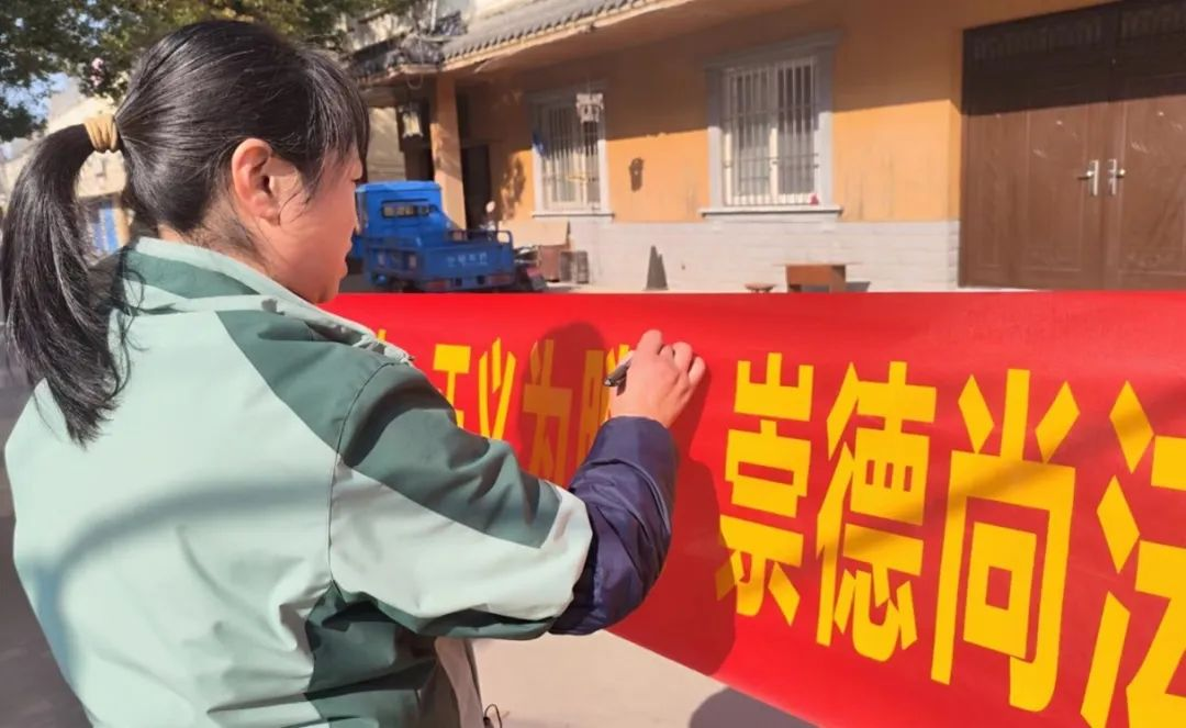下午2时,参与者们集结在村广场,活动组织者进行简要的活动说明,并分发宣传材料和签名笔。随后,以普法知识宣讲内容为主题的宣传横幅被展示在村广场,并吸引了众多村民的关注。横幅上“律法为枪,正义为膛”的口号掷地有声,“崇德尚法,公为天下”的h漫