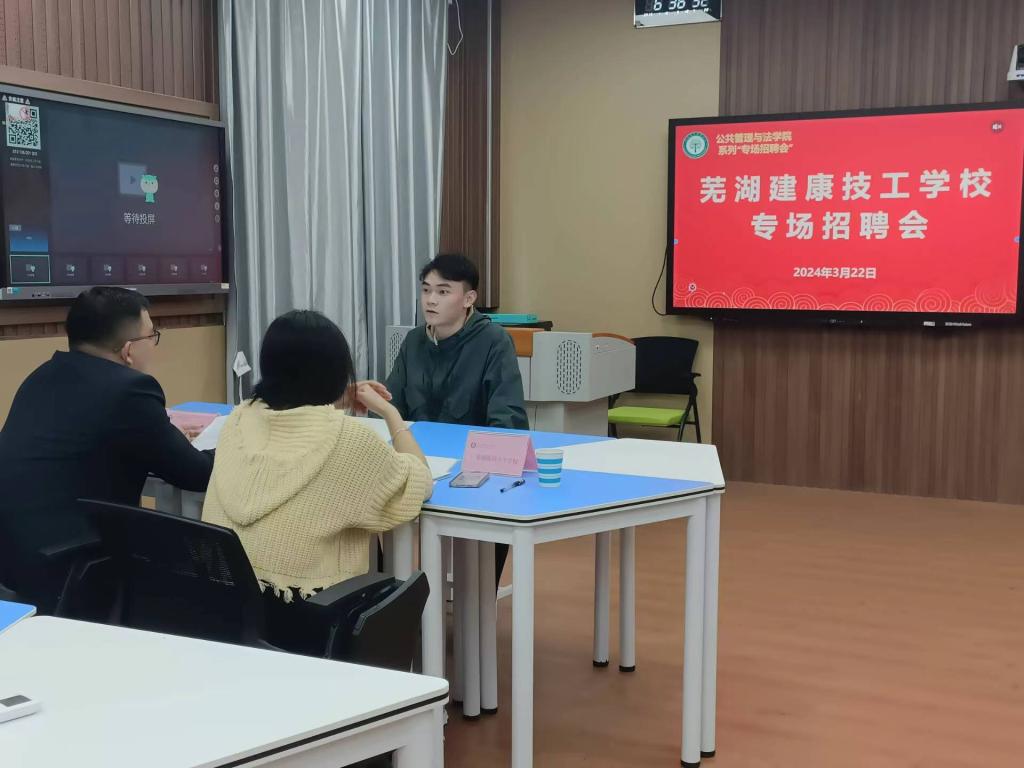学院2024届毕业生积极向用人单位投递简历。芜湖医药卫生学校、芜湖建康技工学校的负责人向同学们介绍了两所学校的发展历程、岗位需求、职业发展、培养体系、晋升制度及薪酬待遇等情况,并对应聘同学分组进行面试。据反馈,两家用人单位在初筛的基础上共接收学院毕业生投递13份,经过初步面试已经达成就业初步意向8人。