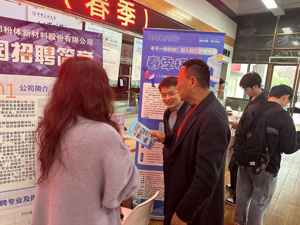 招聘会现场,胡正友、周浩然一行先后走访铜陵四通环境科技有限公司、铜陵金泰化工股份有限公司、安徽美芯新材料有限公司、铜陵贝斯美科技有限公司、海亮(安徽)铜业有限公司等近20家企业,各企业负责人就企业的发展状况、产品研发、人才需求等方面的情况进行了介绍,胡正友认真了解企业用人需求,向企业介绍了h漫