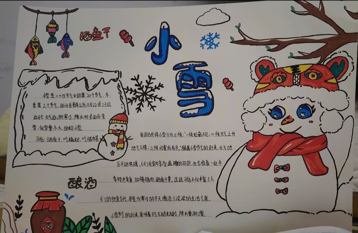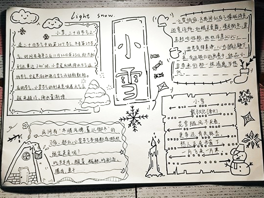 同学们在阐述对小雪节气的认识和制作与小雪有关的手抄报两种形式中选择自己感兴趣活动形式积极参与活动,运用独特的方式表达他们对小雪节气的感受。同学们提交的作品内容文采斐然,手抄报生动形象。在这场活动中,同学们用多样的方式书写对传统节气的热爱。