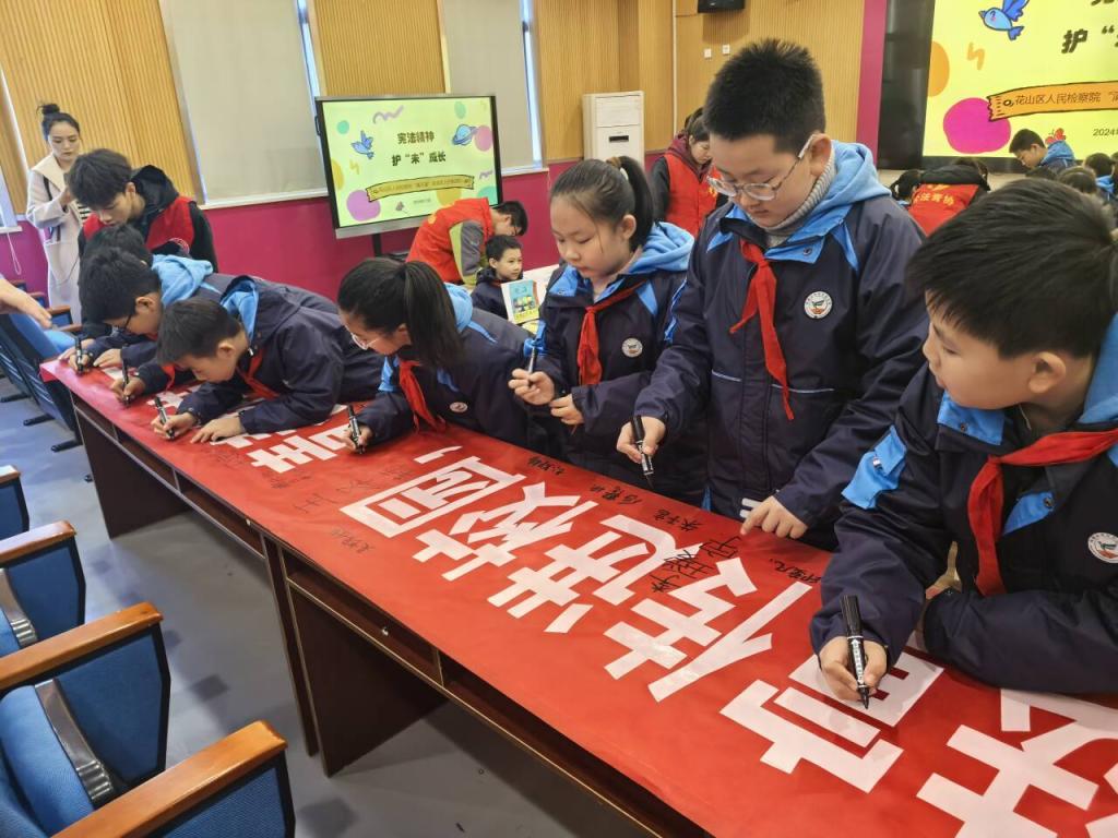 志愿者的帮助下,同学们用手中的彩笔,绘制弘扬宪法精神的手抄报。让孩子们在轻松愉快的氛围中深刻领会宪法的重要意义。活动结束后,同学们一起在普法主题横幅上签字,每一个名字都代表了对法律的尊重与承诺。