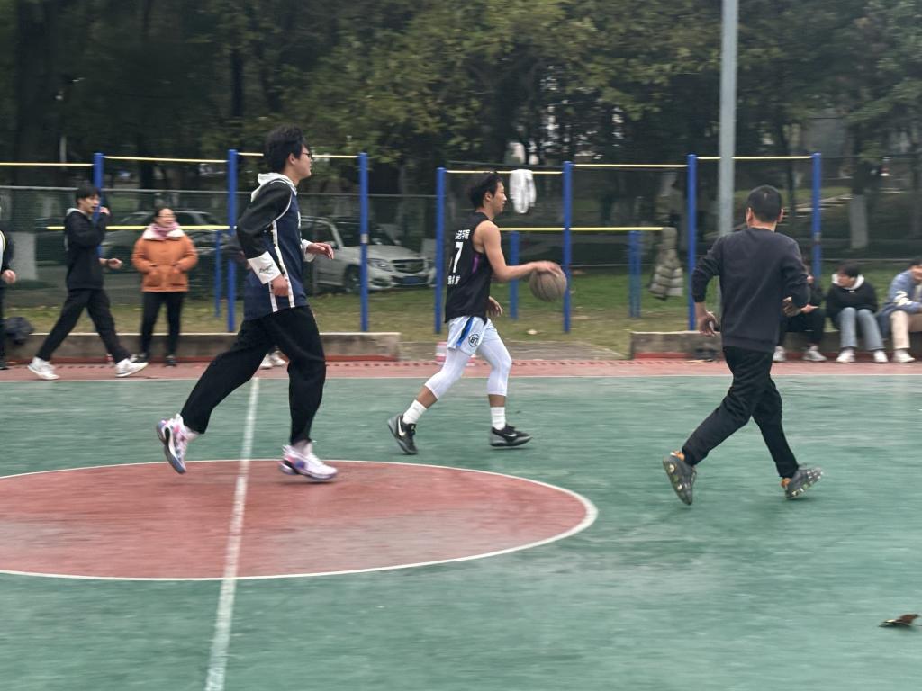 本次友谊赛双方分别为教师团队和行政管理专业的同学。开场后,学生队活力四射,凭借敏捷的身手与充沛的体能,发起一轮轮快攻,抢板、传球、上篮一气呵成。教师队也毫不示弱,经验老到的他们沉着布局,凭借精准的投篮与默契的挡拆战术,紧咬比分。比赛高潮迭起,学生队一记记精彩的灌篮点燃了全场的激情,欢呼声此起彼伏;教师队抓住时机,用稳健的三分远投彰显实力,引得观众阵阵惊叹。场上球员们全力拼搏,汗水湿透了衣衫;场下观众呐喊助威声浪一波高过一波,为师生们加油鼓劲。
