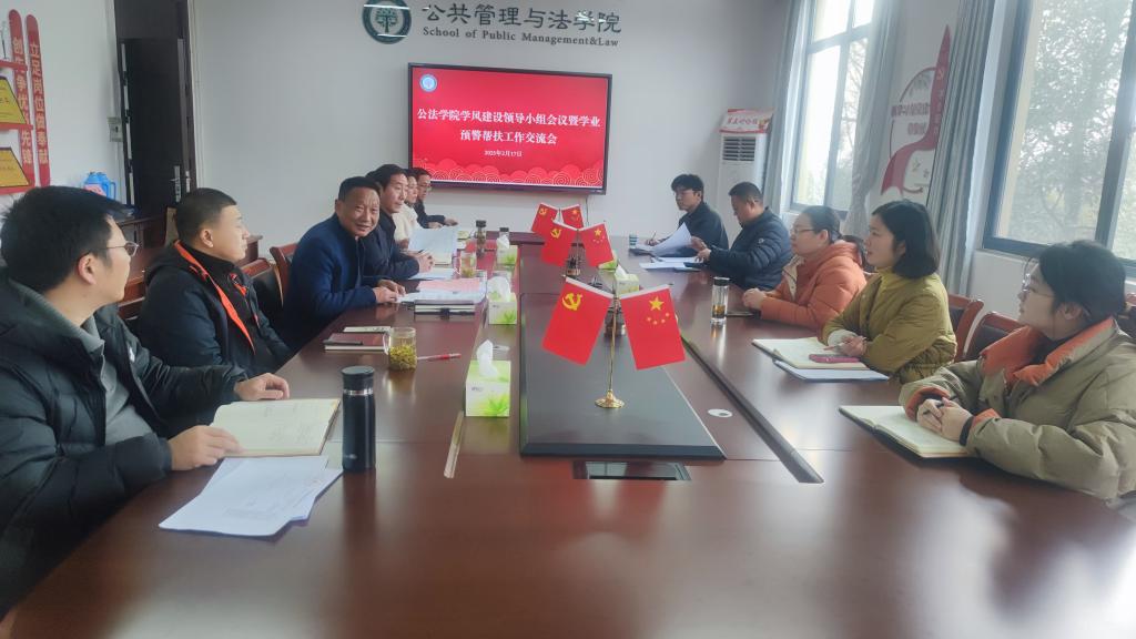 在公法楼402会议室召开学风建设领导小组会议暨学业预警帮扶工作交流会。院党委书记胡正友、院党委副书记周浩然、院教学副院长王务均出席,各专业系室主任、各年级辅导员参加。