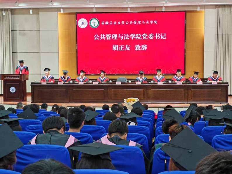 院党委书记胡正友代表学院向同学们圆满完成学业表示祝贺,对他们在大学期间取得的成绩给予高度肯定。他勉励毕业生永葆初心、做逐梦的坚守者,锤炼初心、做清醒的思考者,砺初心、做笃行的奋斗者,始终保持对知识的渴望,以滚烫之心去探索、创造、奉献,深入践行新时代公共管理与法学高层次人才所应具有的奋进心、求知欲、创新力,做全面推进国家治理能力现代化的优秀探索者实践者,在全面推进中国式现代化新征程上大有作为、大展宏图!他希望毕业生继续关心支持母校的建设和发展、继续关心学弟学妹的成长成才。