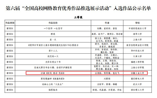 选送的新媒体作品《初见感动传承》(指导教师:王菁、赵一,获奖学生:汪雨航、恽郑曦、张龙飞)获全国高校网络教育优秀作品三等奖。