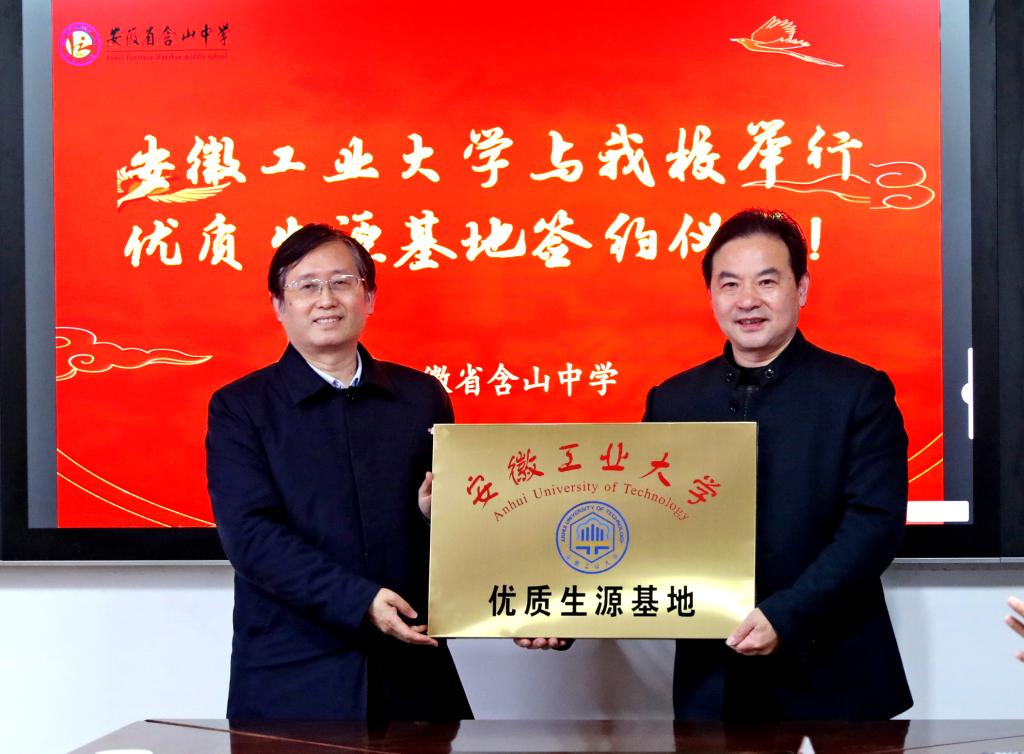 魏先文代表学校向含山中学授予“安徽工业大学优质生源基地”牌匾,与含山中学签署了优质生源基地建设合作协议,送上2021-2022学年度h漫