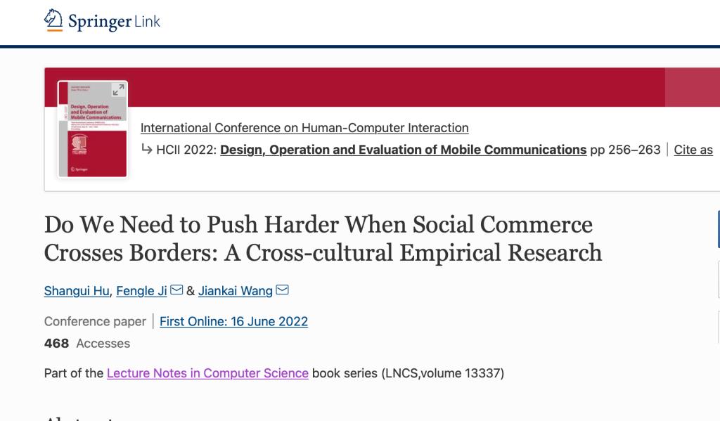 王建凯同学在 HCII 2022在线发表最新研究成果 “Do We Need to Push Harder When Social Commerce Crosses Borders: A Cross-cultural Empirical Research”(//link.springer.com/chapter/10.1007/978-3-031-05014-5_21)。胡善贵副教授为第一作者,h漫