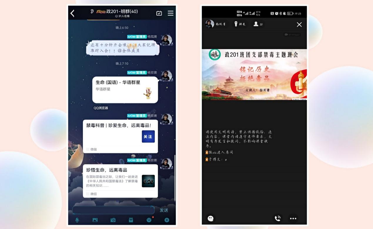 在“铭记历史,拒绝毒品”禁毒宣传主题班会中,各支部积极动员班级成员学习禁毒相关知识,其中政201班团支部通过线上会议的形式,向同学们介绍了一些常见毒品,并教同学们学会分辨毒品,同时向同学们介绍了禁毒的相关知识,讲述了毒品的危害与我国严厉的禁毒政策,使同学们对禁毒有了更深一层的认识。