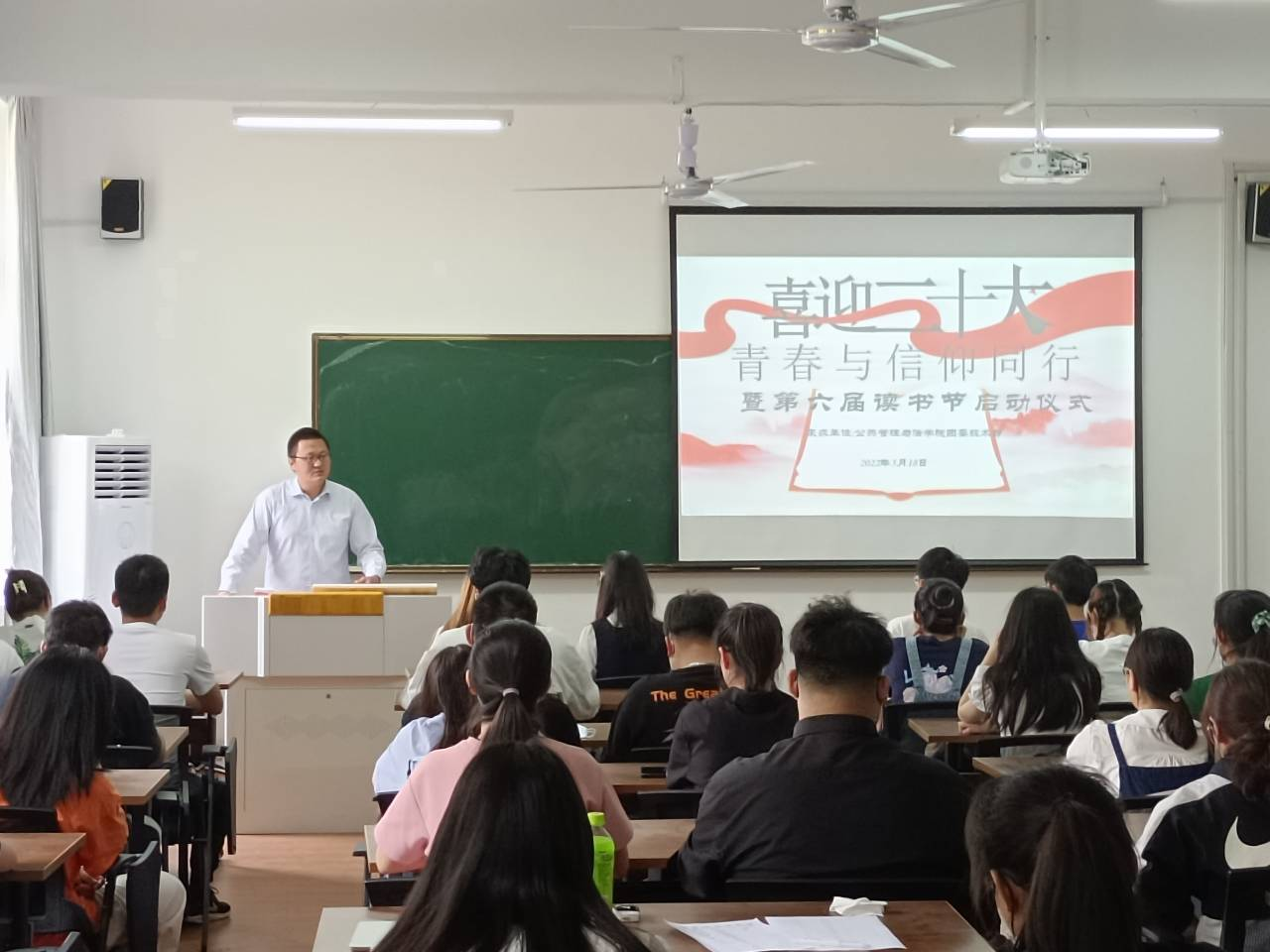 在公法楼205开展了“喜迎二十大·青春与信仰同行”暨第六届读书节主题系列活动启动仪式,学院学生会技术部承办,各年级学生代表百余人参加,院团委书记邢维迢主讲。
