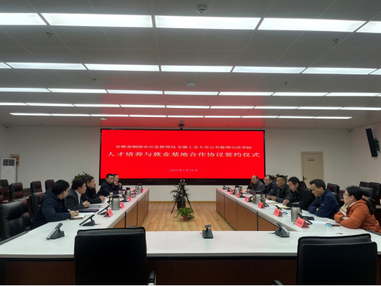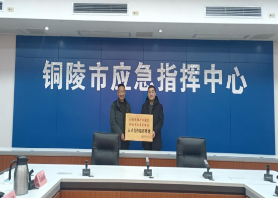铜陵市应急管理局党委书记、局长王伟栋,党委委员、总工程师胡谦;经济与信息化局党组书记、局长李勇,党组成员、副局长汪平等领导热情接待了学院领导老师一行,并共同参加双方人才培养与就业基地合作协议签约暨揭牌仪式。