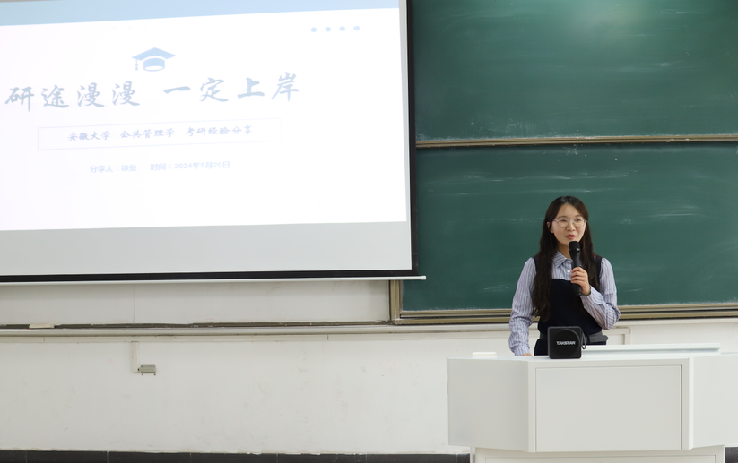 2020级学习优秀奖同学代表,录取南京大学法学专业王策、录取安徽大学行政管理专业徐曼、录取华中师范大学政治学专业丁文佳和录取安徽医科大学梅小兰四位同学结合自身经历,分别从形势研判、院校选择、备考规划、心态调整等方面介绍了自己研路历程,分享了实战经验和技巧。录取英国布里斯托大学的孟连杰同学从自我学业评估、语言复习备考、申请材料撰写、网络在线申请、面试及专业考核、签证出国准备等方面分享了留学深造的全攻略。他们勉励2021级同学坚定信念、迎难而上、突破难关、实现梦想。