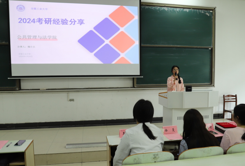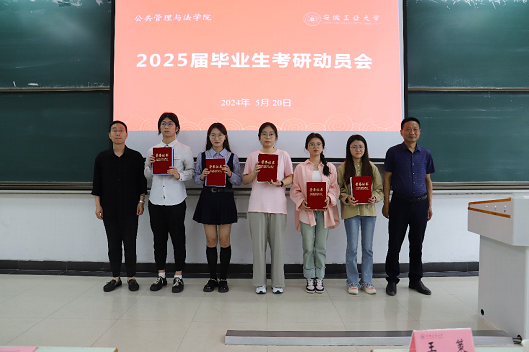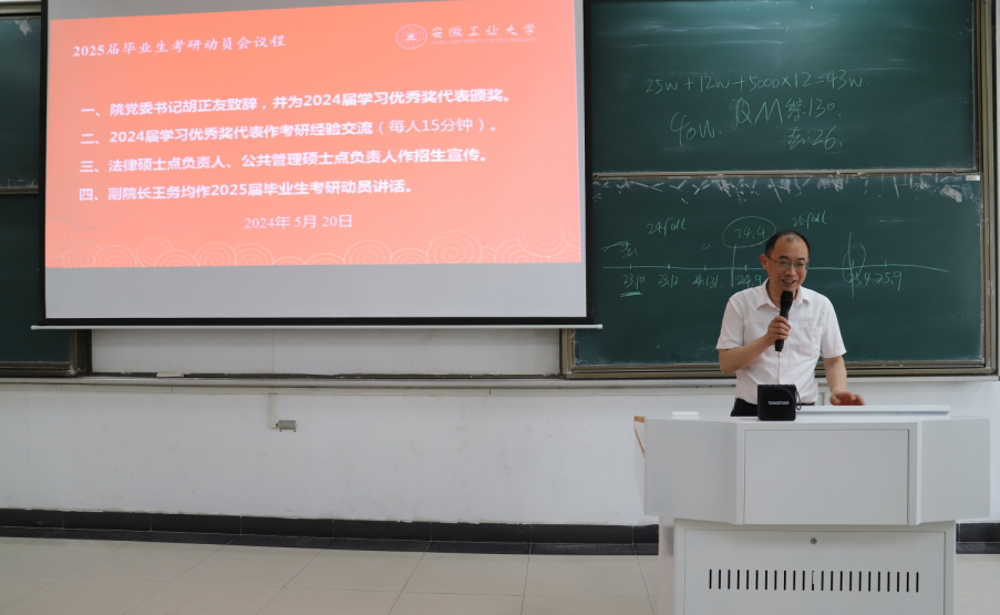 在教三南201教室举行本科生考研深造动员会。院党委书记胡正友,副院长周浩然,王务均,院公共管理学硕士点董少林老师、法律硕士学科点房梁老师,院团委书记朱玲、年级辅导员产兵华,2020级学习优秀奖同学代表和2021级全体同学参加考研动员会。副院长周浩然主持动员会。