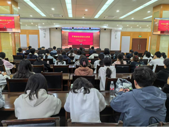 领导、法学系全体教师和部分法学专业学生在佳山校区会议中心二楼报告厅分会场聆听讲座,学院部分师生通过网络线上收看了讲座。