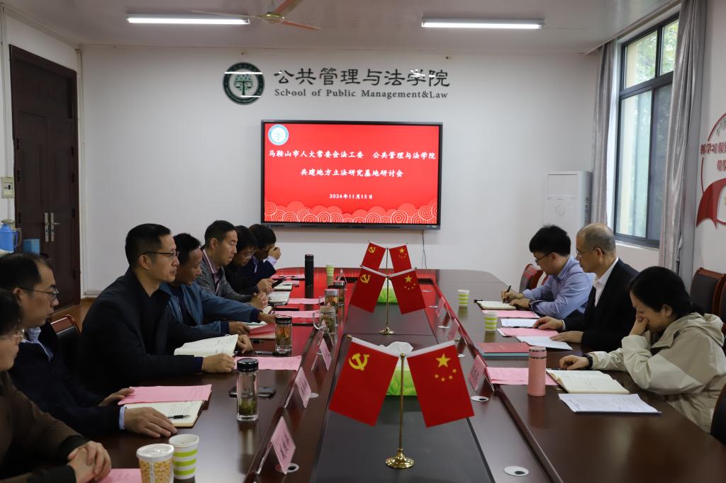 在安徽工业大学公法楼402室就共建地方立法研究基地进行交流。马鞍山市人大常委会法工委主任、二级巡视员任仕金,副主任、一级调研员喻林红,法工委办公室主任王龙、安徽工业大学h漫
