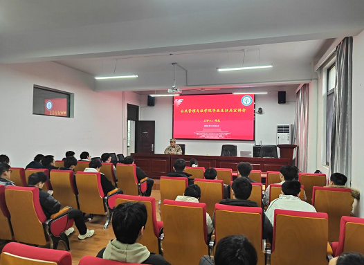在12月23日在公法楼301举办毕业生征兵宣讲会。校招兵工作办稽虎老师主讲,辅导员邢维迢主持,学院21级学生参会。