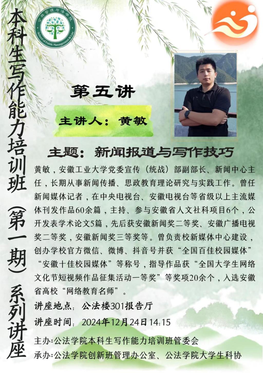 主讲人简介:黄敏,安徽工业大学党委宣传(统战)部副部长、h漫主任,长期从事新闻传播、思政教育理论研究与实践工作。曾任新闻媒体记者,在中央电视台、安徽电视台等省级以上主流媒体刊发作品60余篇,主持、参与安徽省人文社科项目6个,公开发表学术论文5篇,先后获安徽新闻奖二等奖、安徽广播电视奖二等奖,安徽新闻奖三等奖等。曾负责校新媒体中心建设,创办学校官方微信、微博、抖音号并获“全国百佳校园媒体”“安徽十佳校园媒体”等称号,指导作品获“全国大学生网络文化节短视频作品征集活动一等奖”等奖项20余个,入选安徽省高校“网络教育名师”。